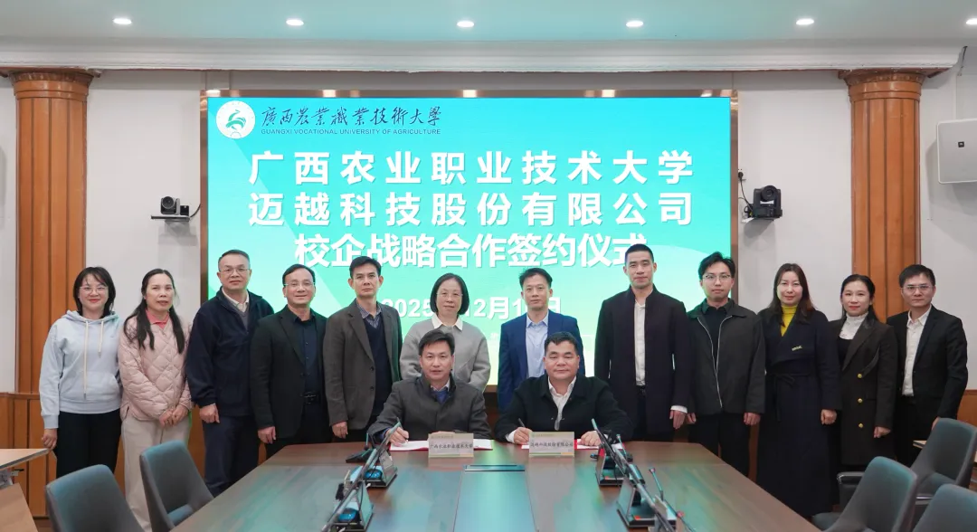 2025-12-16深化产教融合,驱动AI+农业:迈越科技与广西农业职业技术大学签署战略合作框架协议12月16日,迈越科技与广西农业职业技术大学正式签署校企战略合作框架协议,标志着双方在人才培养、科研创新、平台共建等领域的深度协同全面启动。迈越科技董事长李常青,校党委常委、校长李向红共同出席签约仪式。双方将构建长期、稳定的战略合作关系,积极探索校企协同新模式:在人才培养与交流方面,双方将联合制定“AI +农业”人才培养方案,开设定向订单班,共建人才培养基地,培养复合型农业AI人才。在科研与技术创新合作...